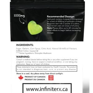 Ingredients: Sugar, Gelatin, Corn Syrup, Citric Acid, Natural & Artificial Flavours, Artificial Colour, Coconut Oil, Psilocybin Mushrooms.