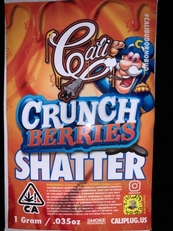 Cali Crunch Shatter also known as βCrunchberry,β βCaptain Crunch,β or βCrunch Berry Kush,β is an indica dominant hybrid (70% indica/30% sativa) strain created through crossing the Triple OG X blueberry strain. This bud is infamous for its flavor that is said to be exactly like Crunch Berries cereal!