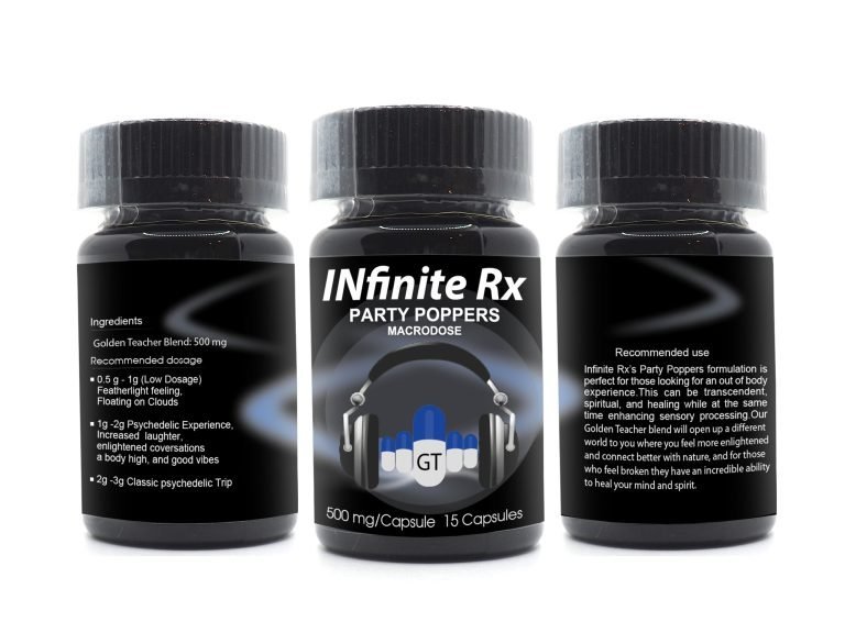 INfinite Rx Party Poppers Golden Teachers (G.T) Macrodosing Mushroom capsules will provide a mildly high psychedelic effect therefore making it a gateway shroom for first timers. The Golden Teacher strain is one of the most popular and common strains of magic mushrooms. They are best known for their shamanistic properties or spiritual effects, euphoric properties, and reliable trip. These mushrooms provide less visuals but an immense perceptual experience. Each bottle contains 15 capsules. Each capsule contains 500mg of our Golden Teacher blend.