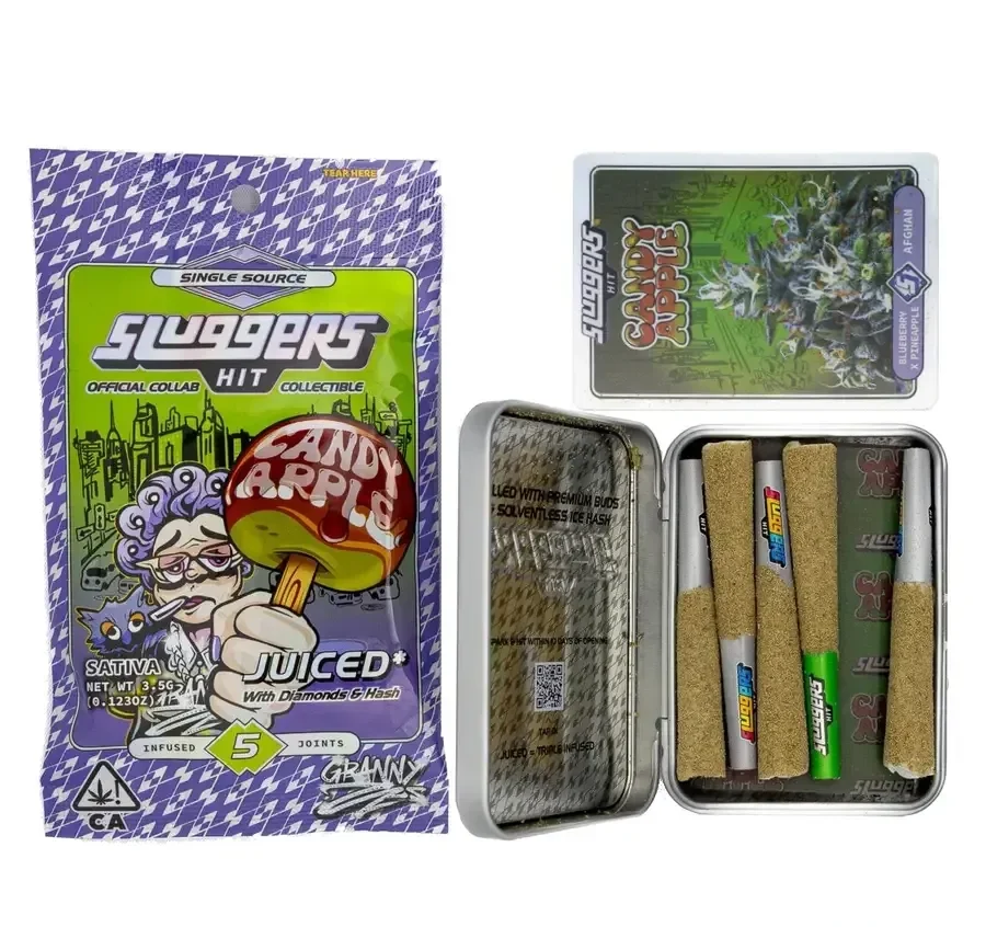 Sluggers Hit Juiced 5 Pack (5 x 0.7g, Total 3.5g) + Collectible Card Enjoy premium cannabis with Sluggers Hit Juiced pre-rolls, crafted by Seth Sznapstajler and Natura Life Science. These pre-rolls feature high-quality flowers coated in kief and infused with Liquid Diamonds and hash. Store in a cool, dry place in an airtight container to maintain freshness and potency.